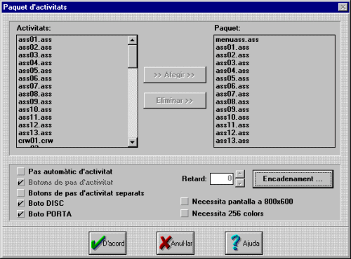 - La llista d'activitats que s'hauran de presentar a l'usuari, que es construeix a partir de les activitats existents a la carpeta de treball mitjançant els botons Afegir i Eliminar.