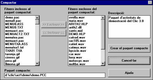 - En la pantalla que apareix a continuació es mostra a l'esquerra la llista de tots els fitxers que passaran a formar part del paquet compacte, i a la dreta la dels que en quedaran exclosos (fitxers WAV, MID, AVI, DLL...):