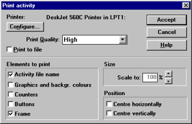 To access the print functions you have to be in the desired activity and select the File -Print menu. You can also place a button on the main screen that directly activates printing, by marking the corresponding box in Activity options.