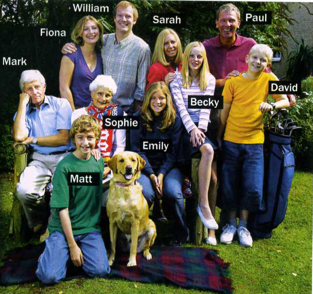Emily and David are brother and sister. They are twins. Their parents' names are William and Fiona. Sophie is Emily's . She's a football fan. Mark is Sophie's and William's . He's quiet and serious. Paul is behind David. He plays golf once a week. Sarah is Paul's . She works in a bank. Becky is Emily's cousin and Sarah's . She's between David and Emily. Matt is Fiona's . He's got a dog. Emily is next to Becky. She is Sophie's .