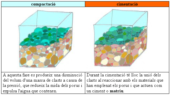 La diagènesi es un procés que presenta dues fases: la compactació i la cimentació.