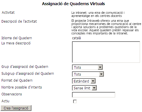 Si cliqueu sobre l'enllaç Assigna'm, s'obre un formulari d'assignació del Quadern Virtual que heu d'omplir. |