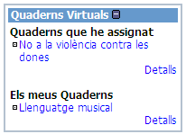 En el bloc de Quaderns Virtuals, apareix la relació de Quaderns que ha assignat l'usuari/ària connectat, així com els Quaderns que li han estat assignats. Si heu assignat Quaderns a altres persones, aquesta informació també apareix al bloc Quaderns Virtuals. En aquest cas, en fer clic sobre els noms dels Quaderns que s'han assignat, s'entra en una fitxa des d'on es pot fer el seguiment dels exercicis portats a terme per part dels usuaris als quals hagueu assignat aquests Quaderns. Des de l'enllaç anomenat Detalls, accedireu a una fitxa amb informació sobre tots els Quaderns que heu assignat a altres persones. |