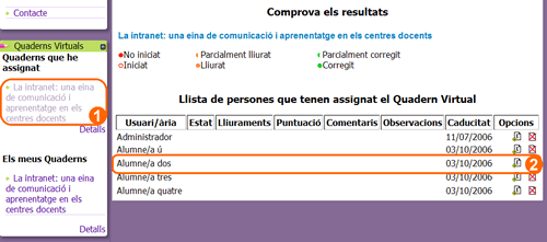 | D'aquesta pantalla, el professor/a pot, per una banda, accedir al Quadern de cada alumne/a i, per una altra, conèixer informació (com ara, l'estat, la puntuació i el nombre de lliuraments) de tots els usuaris que tenen assignat el Quadern. | |||||||
