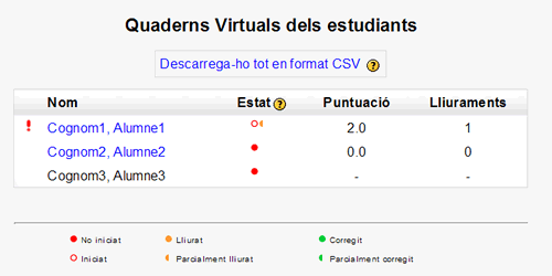 Des de la pantalla de consulta del Quadern Virtual, el professor/a pot, per una banda, accedir al Quadern de cada alumne/a i, per una altra, conèixer l'estat, la puntuació i el nombre de lliuraments de tots els Quaderns dels alumnes inscrits al curs. |